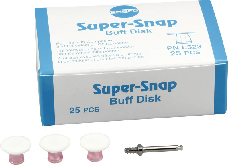Die Super-Snap Buff Disks und Buff Mini-Disks sind Scheiben mit stirnseitigem Filzbelag, der die teuren Polierpasten während der Anwendung festhält und deren Verspritzen weitestgehend verhindert. Die dünnen, flexiblen Scheiben passen sich allen Zahnoberflächen an. Sie sind ohne Metallzentrum und ohne freiliegendes Mandrell konstruiert, um Kompositverfärbungen oder Rillenbildungen zu verhindern. Ein federleichtes Polieren genügt zur Erzielung von Hochglanz bei Keramik und Komposit.