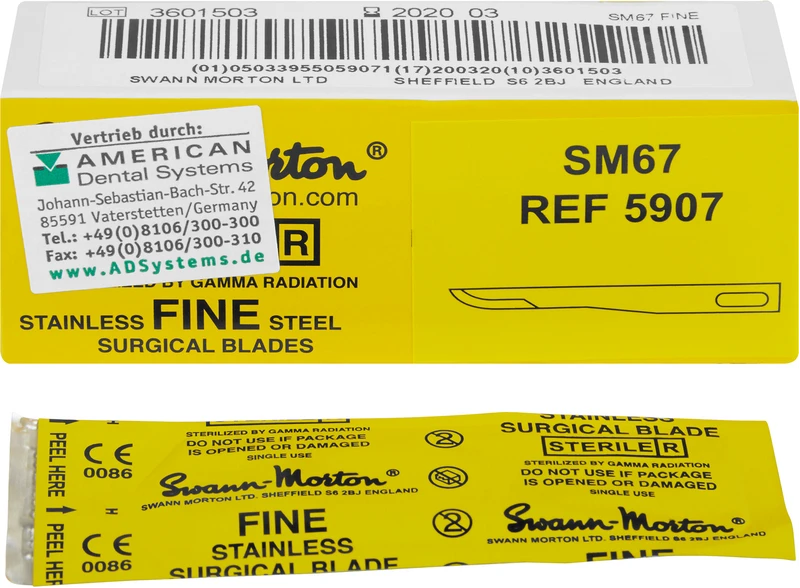 Swann Morton Skalpellklingen nach Prof. Dr. Wachtel und Prof. Dr. Hürzeler. Klingen mit einer sehr langen Haltbarkeit und einer unvergleichlichen Schneidfähigkeit aus Carbon-Stahl. Ausgesuchte Skalpelle aus Edelstahl, die das gesamte Feld der Mikro- und Makrochirurgie abdecken.