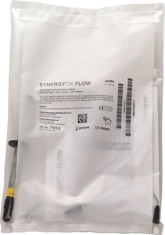 SYNERGY® D6 Flow ist ein nanogefülltes, röntgenopakes Flow Material, basierend auf der erfolgreichen Technologie des SYNERGY® D6 Komposits. Es weist eine erhöhte Röntgensichtbarkeit und eine reduzierte Schrumpfung auf. Das Material ist standfest, fließt aber unter Druck. Eine einfache Anwendung mit punktgenauer Applikation wird gewährleistet.