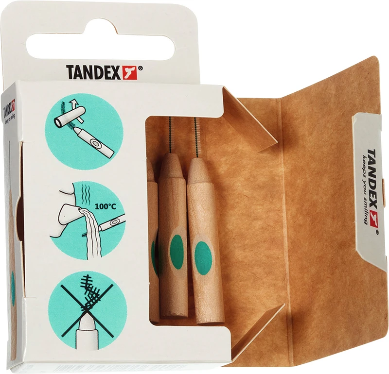 TANDEX WOODI Interdentalbürste - Für Sie und der Umwelt zuliebe. Nachhaltig da keinen Kunststoffgriff, sondern einen feinen Griff aus FSC-zertifiziertem Birkenholz mit einem Gewicht von weniger als 1 Gramm. Der Griff ist zu 100% kompostierbar. Die umweltfreundliche Verpackung ist aus FSC-zertifizierter Pappe. In 6 verschiedenen Gröen mit Schutzhaube erhältlich (6er und 25er Packung).