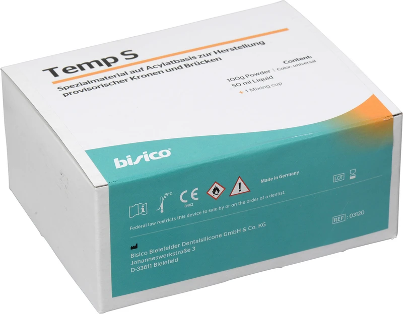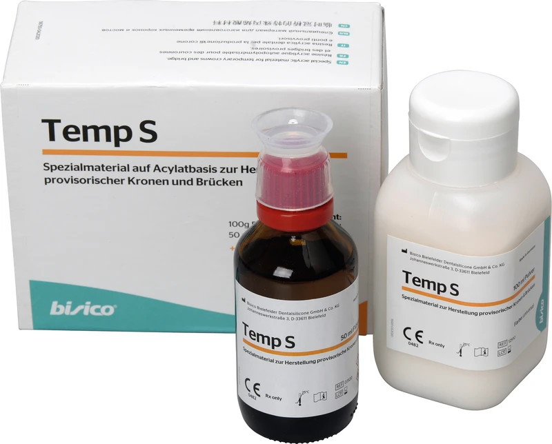 Provisorisches Kronen- und Brückenmaterial. Bisico® Temp S ist ein seit Jahrzehnten bewährtes Material auf Acrylatbasis zur Herstellung provisorischer Kronen und Brücken. Die Anwendung erfolgt durch manuelles Mischen von Pulver und Flüssigkeit und kann intraoral, aber auch extraoral erfolgen. Durch anteiliges Zufügen des Pulvers hell zur Farbe universal, kann das Provisorium im Farbton individuell angepasst werden. Das Material ist bruch- und abriebfest und lässt sich besonders gut ausarbeiten, polieren und reparieren.
