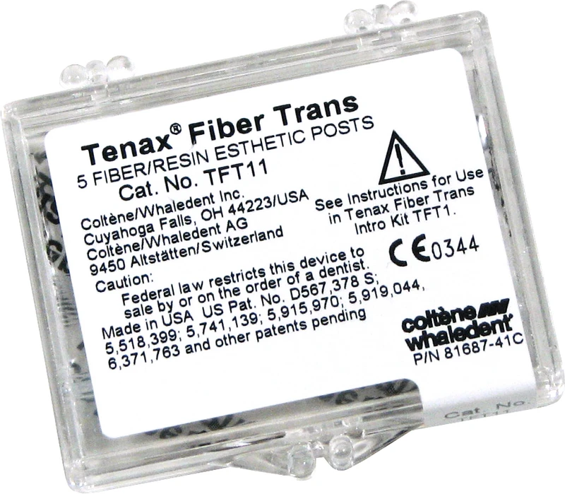 Das TENAX® FiberTrans Stiftsystem ist ein hochwertiges, transluzentes Stiftsystem aus glasfaserverstärktem Harz, das im unteren Stiftdrittel ein konisches Design (.04) aufweist. TENAX FiberTrans Stifte sind mit konischen TENAX Bohrern kompatibel.