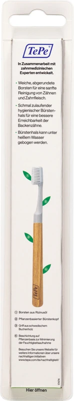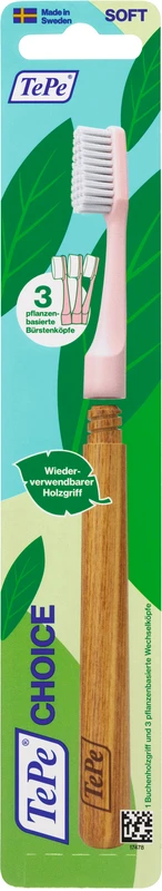 Sind Sie bereit für eine Innovation? Die neue TePe Choice Zahnbürste punktet mit einem wiederverwendbaren Griff aus schwedischem Buchenholz und drei austauschbaren Bürstenköpfen in jeder Verpackung. Da nur der Bürstenkopf ausgetauscht wird, werden Rohstoffe eingespart und der CO2-Fußabdruck des Produktes reduziert.Der hygienische und unter heißem Wasser biegbare Bürstenkopf wird mit nachwachsenden Rohstoffen hergestellt. Die weichen, abgerundeten Borsten bestehen aus Rizinusöl. Zur Minimierung der Feuchtigkeitsaufnahme ist der Holzgriff mit einer Beschichtung auf Pflanzenbasis versehen.Farblich nicht sortiert.