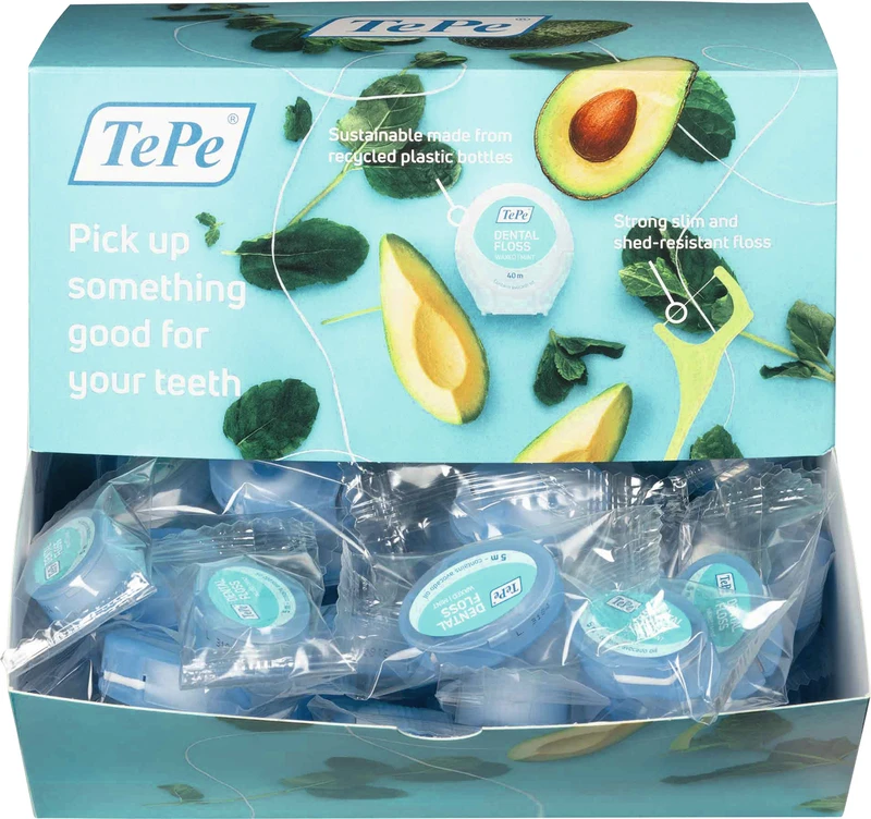Das TePe® Dental Floss ist eine sich ausdehnende Zahnseide, die Plaque effizient und sanft zwischen den Zähnen entfernt. Die Zahnseide ist mit einer Beschichtung aus pflanzlichem Wachs und Avocadoöl versehen und gleitet leicht zwischen den Zähnen, ohne zu zerfasern. Sie wird aus recycelten Wasserflaschen hergestellt, um die Umwelt zu schonen. Um Zähne und Zahnfleisch gesund zu erhalten, wird eine tägliche Anwendung empfohlen.