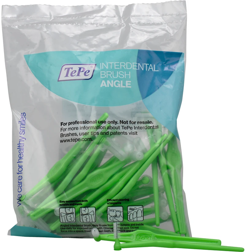 TePe® Interdentalbürsten Angle sind einfache anzuwendende Interdentalbürsten, die eine gründliche Reinigung aller Interdentalräume ermöglicht. Durch den schmalen, gewinkelten Bürstenkopf ist die Reinigung im Molarenbereich - sowohl palatinal, lingual als auch bukkal möglich. Der lange und flache Griff ermöglicht eine kontrollierte Reinigung der Interdentalräume. TePe® Interdentalbürsten Angle sind in sechs Größen erhältlich. Die Größen richten sich nach den TePe® Interdentalbürsten Original. Alle Größen haben einen kunststoffummantelten Draht zur schonenden Reinigung.