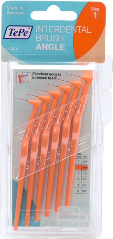 TePe® Interdentalbürsten Angle sind einfache anzuwendende Interdentalbürsten, die eine gründliche Reinigung aller Interdentalräume ermöglicht. Durch den schmalen, gewinkelten Bürstenkopf ist die Reinigung im Molarenbereich - sowohl palatinal, lingual als auch bukkal möglich. Der lange und flache Griff ermöglicht eine kontrollierte Reinigung der Interdentalräume. TePe® Interdentalbürsten Angle sind in sechs Größen erhältlich. Die Größen richten sich nach den TePe® Interdentalbürsten Original. Alle Größen haben einen kunststoffummantelten Draht zur schonenden Reinigung.