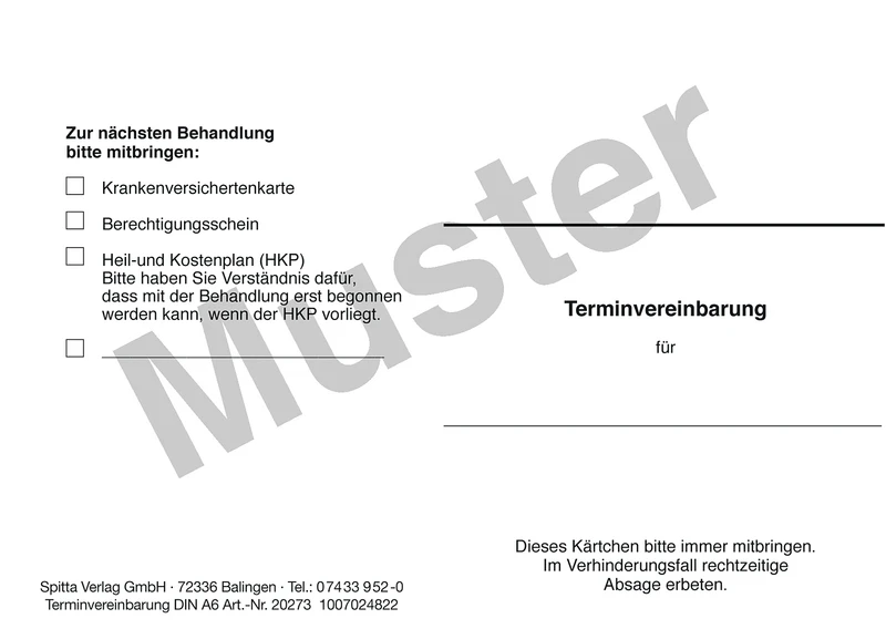 Eine Zusatzinformation warum es so wichtig ist, dass Termine eingehalten werden und praktische Ankreuzfelder mit Informationen was die Patienten zum nächsten Termin eventuell noch mitbringen müssen, befinden sich zusätzlich auf dieser Karte.