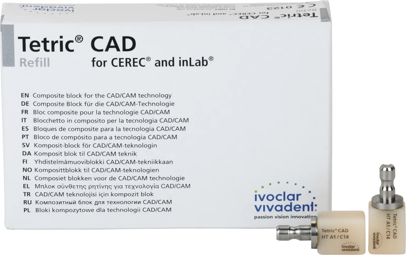 Tetric® CAD ist ein ästhetischer Composite Block für effizient hergestellte, indirekte Einzelzahnrestaurationen mittels CAD/CAM Technologie. Tetric® CAD basiert auf der bewährten Tetric® Technologie und ist die digitale Ergänzung zur direkten Füllungstherapie der Tetric® Evo-Linie. Durch den ausgeprägten Chamäleon-Effekt gliedern sich Tetric® CAD-Restaurationen optisch natürlich in die Restzahnsubstanz ein. Die Restauration wird nach dem Schleifen poliert und adhäsiv eingegliedert. Dieser Verarbeitungsweg ist sehr effizient und führt einfach und schnell zu einem ästhetischen Ergebnis. Die Blöcke sind in den Transluzenzstufen MT und HT in jeweils 5 bzw. 4 Farben und in den Grössen I12 und C14 verfügbar. Tetric® CAD ist für folgende CAD/CAM-Systeme verfügbar: PrograMill (Ivoclar Digital), CEREC®/inLab (Dentsply-Sirona), PlanMill® (Planmeca)
