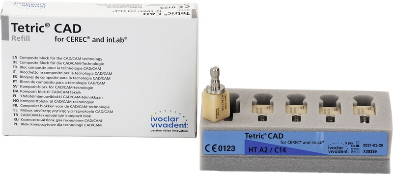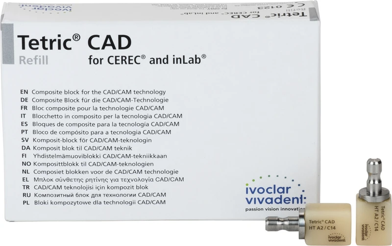 Tetric® CAD ist ein ästhetischer Composite Block für effizient hergestellte, indirekte Einzelzahnrestaurationen mittels CAD/CAM Technologie. Tetric® CAD basiert auf der bewährten Tetric® Technologie und ist die digitale Ergänzung zur direkten Füllungstherapie der Tetric® Evo-Linie. Durch den ausgeprägten Chamäleon-Effekt gliedern sich Tetric® CAD-Restaurationen optisch natürlich in die Restzahnsubstanz ein. Die Restauration wird nach dem Schleifen poliert und adhäsiv eingegliedert. Dieser Verarbeitungsweg ist sehr effizient und führt einfach und schnell zu einem ästhetischen Ergebnis. Die Blöcke sind in den Transluzenzstufen MT und HT in jeweils 5 bzw. 4 Farben und in den Grössen I12 und C14 verfügbar. Tetric® CAD ist für folgende CAD/CAM-Systeme verfügbar: PrograMill (Ivoclar Digital), CEREC®/inLab (Dentsply-Sirona), PlanMill® (Planmeca)