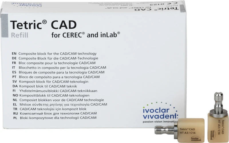 Tetric® CAD ist ein ästhetischer Composite Block für effizient hergestellte, indirekte Einzelzahnrestaurationen mittels CAD/CAM Technologie. Tetric® CAD basiert auf der bewährten Tetric® Technologie und ist die digitale Ergänzung zur direkten Füllungstherapie der Tetric® Evo-Linie. Durch den ausgeprägten Chamäleon-Effekt gliedern sich Tetric® CAD-Restaurationen optisch natürlich in die Restzahnsubstanz ein. Die Restauration wird nach dem Schleifen poliert und adhäsiv eingegliedert. Dieser Verarbeitungsweg ist sehr effizient und führt einfach und schnell zu einem ästhetischen Ergebnis. Die Blöcke sind in den Transluzenzstufen MT und HT in jeweils 5 bzw. 4 Farben und in den Grössen I12 und C14 verfügbar. Tetric® CAD ist für folgende CAD/CAM-Systeme verfügbar: PrograMill (Ivoclar Digital), CEREC®/inLab (Dentsply-Sirona), PlanMill® (Planmeca)