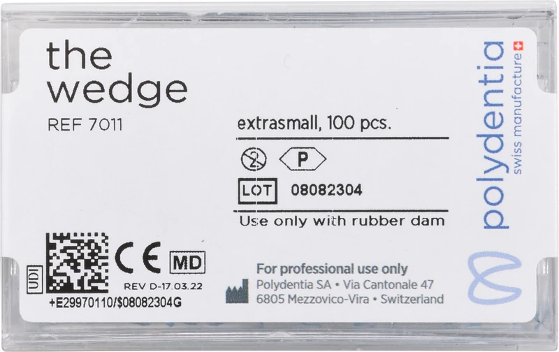 The Wedge ist aus einer speziellen Mischung von elastomerischen thermoplastischen Polymeren hergestellt. Die Elastizität und die Weichheit des Materials sichern eine perfekte Anpassung der Matrizen. Darüber hinaus erlaubt anatomische Form des Keiles mit seinem genialen Kopf eine schonende Einführung in den Interdentalraum und eine optimale Verkeilung der Zähne.