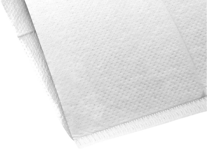 Tissue 26 g/m² + Polyethylen. 1 Lage extrastarkes (26g/m²), saugfähiges Tissue aus reinem Zellstoff und 1 Lage PE-Folie. Geprägt und gefaltet. Latexfrei.