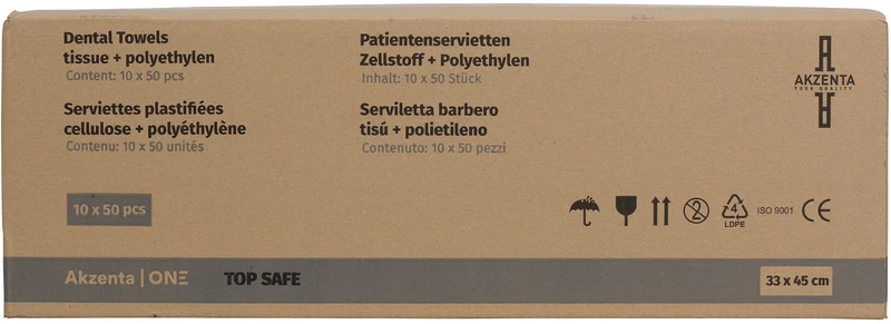 1 Lage Tissue aus reinem Zellstoff von 26g/m² und 1 Lage PE-Folie. Die speziellen Eigenschaften der Materialien bieten höchste Saugfähigkeit und Wasserbeständigkeit, um einen hohen Komfort des Patienten zu garantieren. Geprägt und gefaltet. Latexfrei.