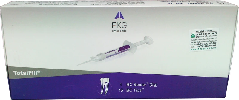 Anders als konventionelle Sealer nutzt Total Fill BC Sealer die natürliche Feuchtigkeit in den Dentintubuli für die Aushärtung. Der hoch radiopake und hydrophile Total Fill BC Sealer (vorgemischt in der Spritze) bildet beim Aushärten Hydroxyapatit und geht eine chemische Bindung mit dem Dentin und dem Füllmaterial Total Fill BC Points (biokeramische Spitzen) ein. Dank seines stark basischen pH-Werts wirkt Total Fill BC Sealer während des Aushärtens antibakteriell und weist absolut keine Schrumpfung auf.