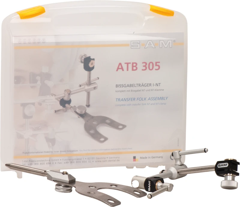 Selbstsymmetrierender, besonders leichter (130 g) und verwindungssteifer Scherenbogen mit anatomisch richtigen Ohroliven für schnelles und präzises Anlegen am Patienten, Nasionstütze mit Nivellierstab, Ausrichtung und Kontrolle parallel zur Bipupillarlinie. Bissgabelträger I-NT: zwei Knebel, Bissgabelträger AX ein Knebel.
