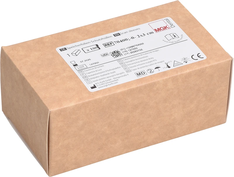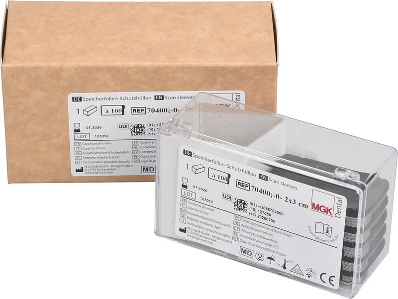 Die Speicherfolien-Schutzhüllen sind einmal verwendbare Kunststoffhüllen zum Schutz des Patienten vor Partikelkontaminationen durch die Speicherfolie, zur Vermeidung von Kreuzkontaminationen unter Patienten und zum Schutz (Licht, Staub, Schmutz, physikalische Beschädigung) der intraoralen Speicherfolien bei digitalen Dental-Röntgenaufnahmen. Die Schutzhüllen sind in 5 Größen (0, 1, 2, 3, 4) erhältlich und kompatibel mit den gängigen Speicherfoliengrößen auf dem Markt.