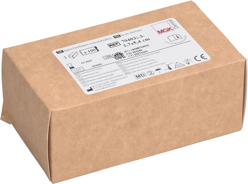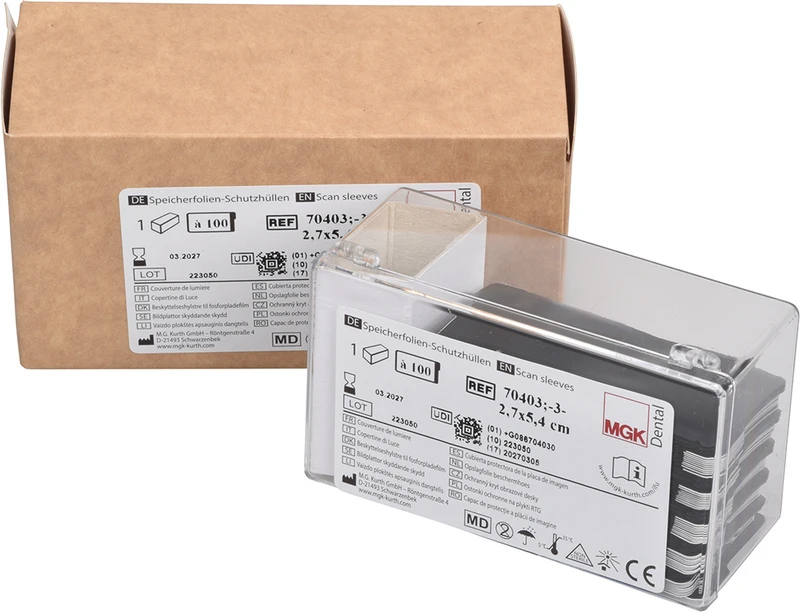 Die Speicherfolien-Schutzhüllen sind einmal verwendbare Kunststoffhüllen zum Schutz des Patienten vor Partikelkontaminationen durch die Speicherfolie, zur Vermeidung von Kreuzkontaminationen unter Patienten und zum Schutz (Licht, Staub, Schmutz, physikalische Beschädigung) der intraoralen Speicherfolien bei digitalen Dental-Röntgenaufnahmen. Die Schutzhüllen sind in 5 Größen (0, 1, 2, 3, 4) erhältlich und kompatibel mit den gängigen Speicherfoliengrößen auf dem Markt.