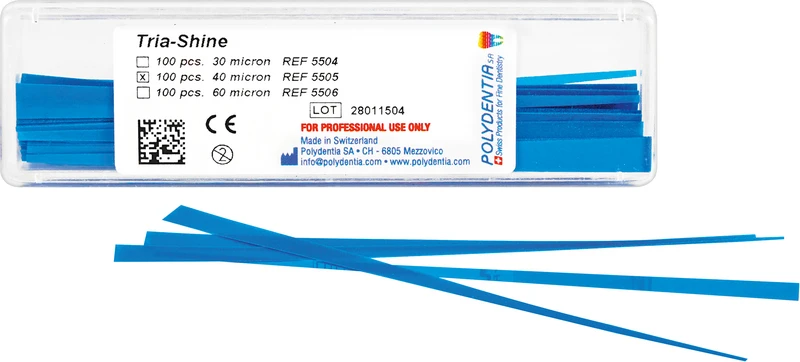 Die Konturier- und Finierstreifen zum Ausarbeiten der approximalen Kompositfüllungsflächen sind aus flexiblem Polyester mit einer Aluminiumoxydbeschichtung. Die dreieckige Form des Streifens (Breite von 1,5 - 5,5 mm) erlaubt ein einfaches Einführen in den Interdentalraum. 3 verschiedenen Körnungen, farbkodiert .