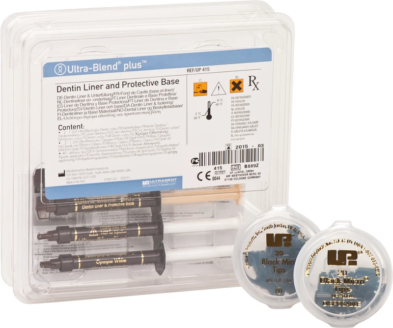 Kit 2 x 1,2 ml Spritze Ultra-Blend plus dentin, 2 x 1,2 ml Spritze Ultra-Blend plus opaque white, 20 Black Micro Tips, 20 Black Mini Tips