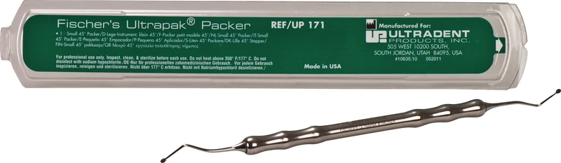Spezielle Lege-Instrumente, erleichtern das Platzieren von Ultrapak-Retraktionsfäden. Die dünnen Enden sinken in die gestrickten Fäden ein, so wird der Faden sicher in den Sulcus eingebracht und eine Verletzung des Attachments vermieden. Gezahnte Instrumente für axiales Stopfen, glatte Instrumente für horizontal-gleitendes Einbringen.