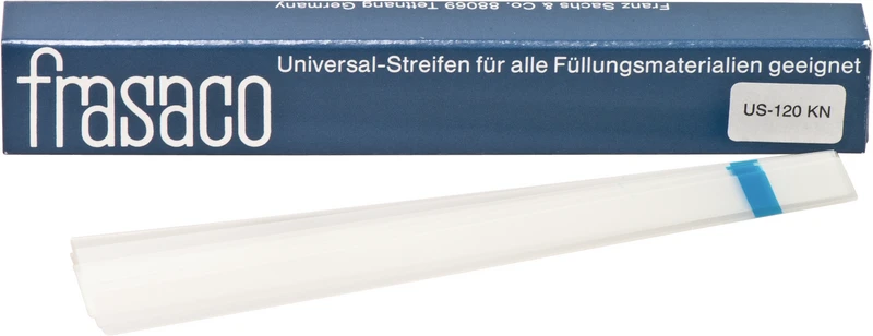 Universal-Streifen aus reissfestem Polyestermaterial für die Verarbeitung von autopolymerisierenden und photopolymerisierenden Kunststoffen sowie Zementen geeignet. Zur besseren Wahrnehmung auf dem Zahn gibt es die Streifen in Kupferton-Transparent. Die Streifen in Kupferton-Transparent sind jedoch nicht für die Lichtpolymerisation von Kompositen geeignet.