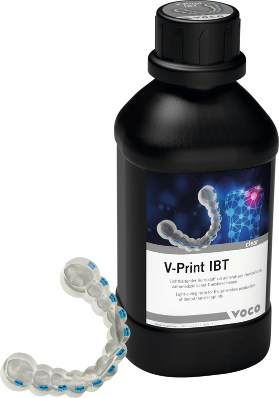 V-Print IBT PRÄZISE BRACKETPOSITIONIERUNG, REDUZIERTEBEHANDLUNGSZEITEN UND MAXIMALER KOMFORTDigital geplante Transferschienen ermöglichen die präzise Übertragung multipler Brackets auf die zuvor virtuell bestimmte ideale Position auf den Zähnen. Das führt nicht nur zu einer höheren Genauigkeit bei der Positionierung, sondern auch zu einem effizienteren Ablauf in der Behandlung. Der Datensatz für das sogenannte Indirect Bonding Tray (IBT) wird aus einer entsprechenden Software generiert. In kurzer Zeit entsteht aus dem speziellen 3D-Druckmaterial V-Print IBT das patientenindividuelle Übertragungstray.Einfache Handhabung mit V-Print IBTBeim indirekten Klebeprozess ist die einfache Handhabung des Trays essentiell. Das lichtdurchlässige V-Print IBT ist flexibel und ermöglicht ein Einfaches platzieren und lösen der Schiene aus dem Patientenmund. Die optimierte Flexibilität macht V-Print IBT zu einem verlässlichen Partner auch bei starker Dysgnathie. In Kombination mit dem hohen Rückstell-vermögen erlaubt das reversible Verformen des Trays die genaue Positionierung der Brackets selbst wenn keine gemeinsame Ein-schubrichtung vorliegt.Erhöhte BehandlungsergonomieAber auch die Ergonomie bei der Behandlung wird durch die indirekte Klebetechnik deutlich verbessert, sowohl in der Planungs- als auch in der Umsetzungsphase. Im Vergleich zum herkömmlichen Verfahren wird die klinische Phase des Klebens deutlich verkürzt. Dies bedeutet eine immense Zeitersparnis für Patienten und Kieferorthopäden.Kein Aufschütteln - sofort EinsatzbereitAuch V-Print IBT muss nicht aufgeschüttelt werden und ist sofort einsatzbereit. Das vereinfacht die Handhabung und beschleunigt den Prozess zusätzlich.