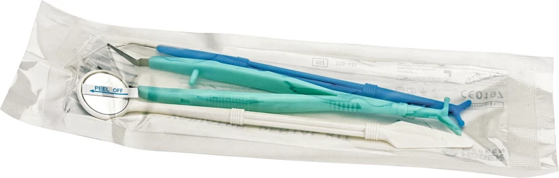 Einmalbehandlungsset. Enthält Mundspiegel, Pinzette und Sonde. Großer Anmischspatel zum Mischen von Zement und Füllungsmaterialien. Kugelkopf und Heidemannspatel zum Stopfen. Praktisch bei Hausbesuchen, Risikopatienten und in Notfällen. Alle drei Instrumente sind steril und zusammen blisterverpackt.
