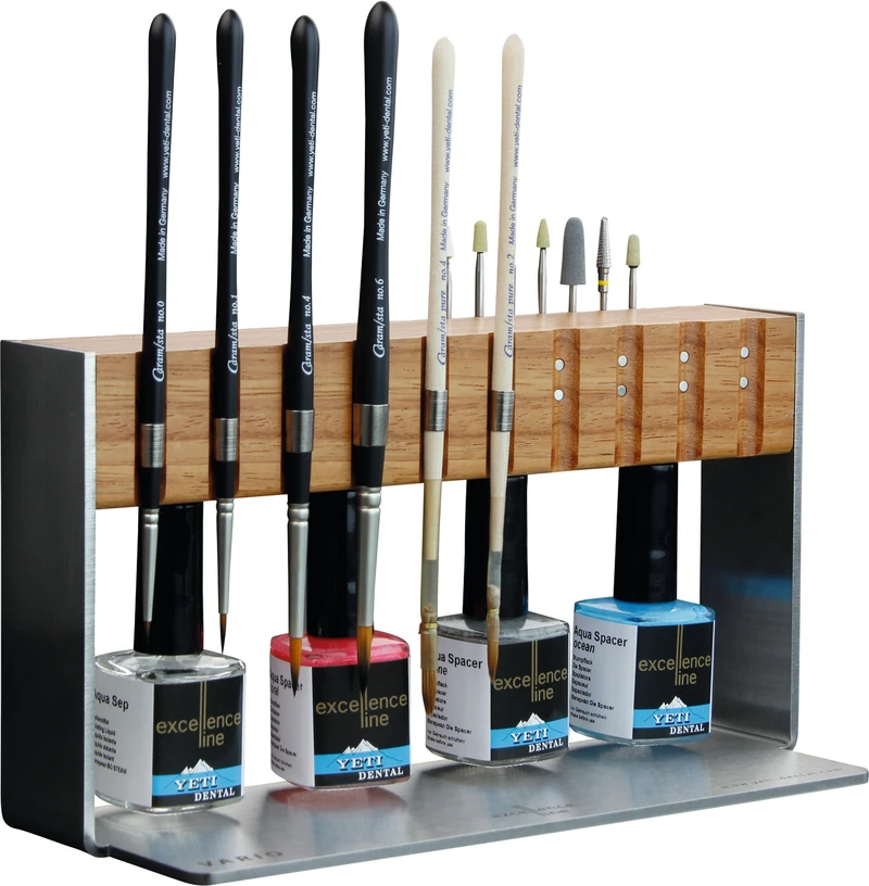 Der Vario Magnetständer - bildet das Herzstück unserer excellence line. Formschön und aus edelsten Materialien gefertigt, bietet dieses Multitalent die Möglichkeit zur magnetischen Aufnahme der Produkte unserer excellence line. So finden Aqua Spacer, Schleifer des Zirkonschleifset, K2 Lube und Caramista Pinsel sofort wie von Zauberhand magnetisch ihren Platz. Ihr Arbeitsplatz bleibt stets aufgeräumt, alle Produkte sind übersichtlich angeordnet und sofort griffbereit. Dies spart Platz und Zeit. Zusätzlich werden die hochwertigen Materialien wie z.B. Pinselspitzen durch eine hängende Lagerung geschont. So werden sie lange Freude an Ihren excellenten Produkten haben.