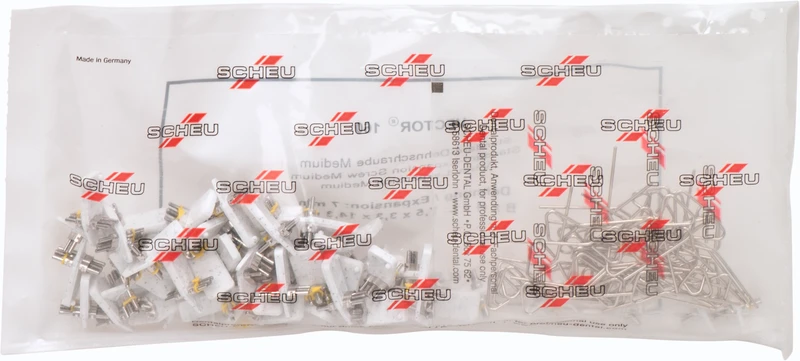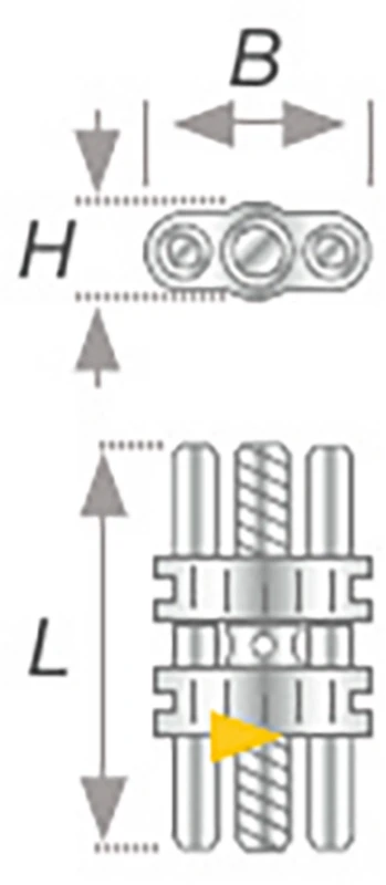 Skelettierte Dehnschraube in Miniaturbauweise für Unterkiefer-Transversaldehnung. Kann auch in schmalen Oberkiefern eingesetzt werden. Leuchtgelber Drehrichtungspfeil.
