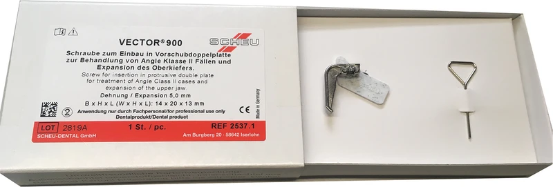 Schraube für Vorschubdoppelplatte zur Behandlung von Angle Klasse II Fällen (Unterkieferretrusion/Distalbisslage) und gleichzeitiger bilateraler Expansion des Oberkiefers von Kindern im Wachstum. Kompakte Bauweise mit integrierter Dehnschraube, inklusive Sicherheitsdehnschlüssel und SD-Box. Für den UNterkiefer empfehlen wir die Kombination mit Vector 100.