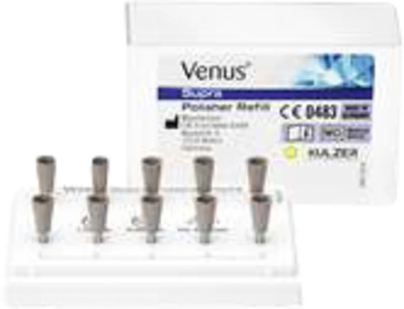 Die mit mikrofeinem Diamantpulver hochgefüllten Silikonpolierer stellen einen lang anhaltenden, natürlichen Hochglanz sicher. Venus® Supra ist ein hochleistungsfähiges Poliersystem, das mit Vor- und Hochglanzpolierern in fünf unterschiedlichen Formen eine universelle Lösung für alle Komposit- und Restaurationsarten bietet. Mit dem autoklavierbaren und damit wiederverwendbaren Venus® Supra Poliersystem werden die Polierergebnisse signifikant in nur zwei Arbeitsschritten verbessert.