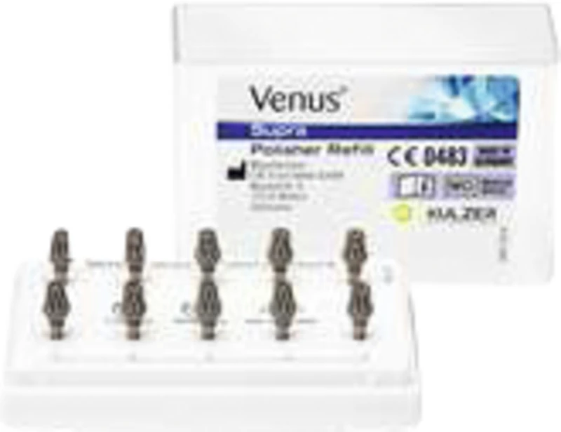 Die mit mikrofeinem Diamantpulver hochgefüllten Silikonpolierer stellen einen lang anhaltenden, natürlichen Hochglanz sicher. Venus® Supra ist ein hochleistungsfähiges Poliersystem, das mit Vor- und Hochglanzpolierern in fünf unterschiedlichen Formen eine universelle Lösung für alle Komposit- und Restaurationsarten bietet. Mit dem autoklavierbaren und damit wiederverwendbaren Venus® Supra Poliersystem werden die Polierergebnisse signifikant in nur zwei Arbeitsschritten verbessert.