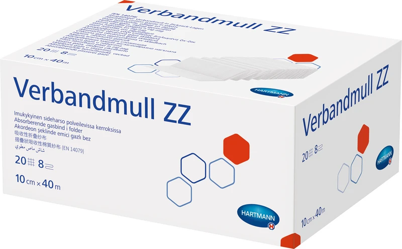 Verbandmull EN 14079; erhältlich in Zickzack-Lagen auf 10 cm Breite gelegt und als Meterware in Stücken zu 40 m.