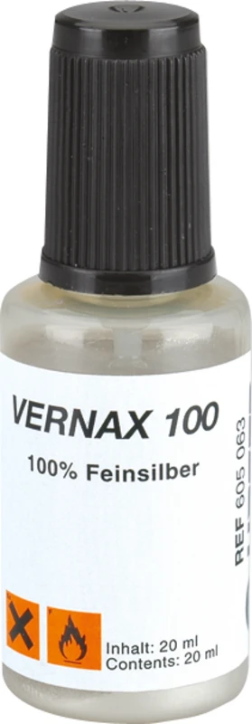VERNAX® 100, Distanzlack für Stümpfe, 100 % Feinsilber. Gleichmäßiger Film von 8-10 Micron, unlöslich gegen alle Isoliermittel und gegen Abdampfen. Hitzefest beim Tiefziehen und Tauchwachsen, schnelltrocknend. Mit Aceton sauber zu entfernen. Wird zur Verarbeitung von z. B. Empress empfohlen.