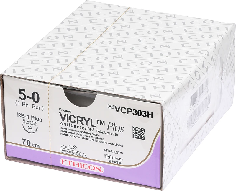 VICRYL Plus ist ein synthetisches, resorbierbares Nahtmaterial mit einer polyfilen Struktur. Dieses antiseptisch beschichtete Nahtmaterial mit Triclosan zeigt eine Reduzierung des Risiokos von postoperativen Wundinfektionen.