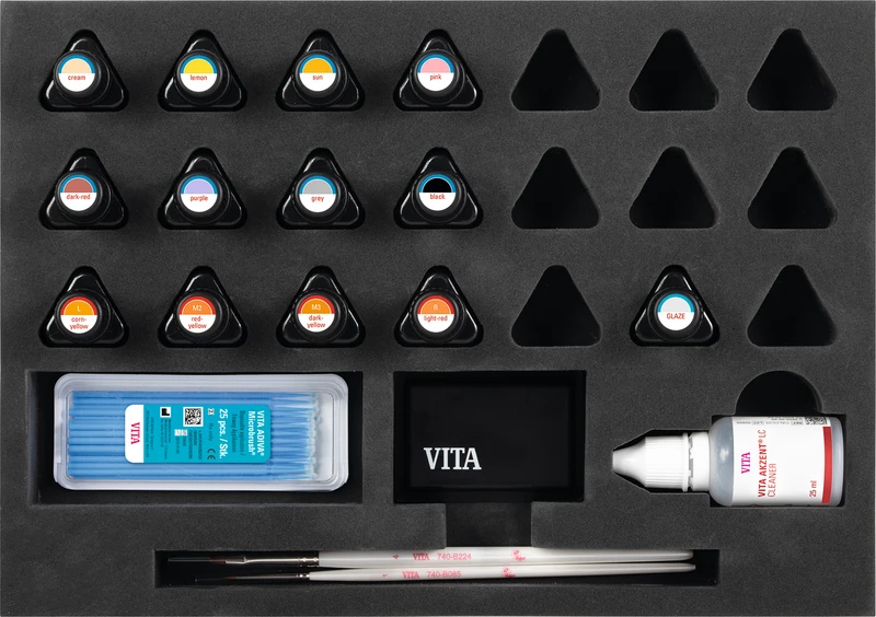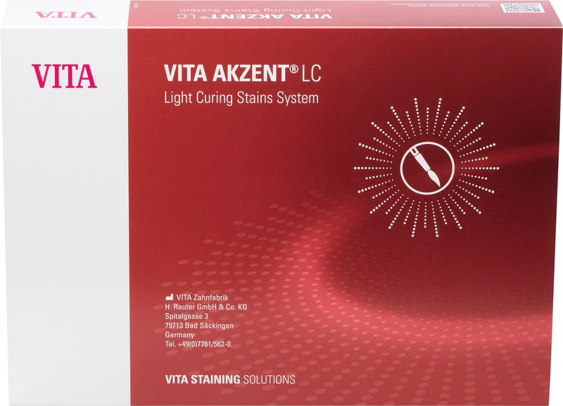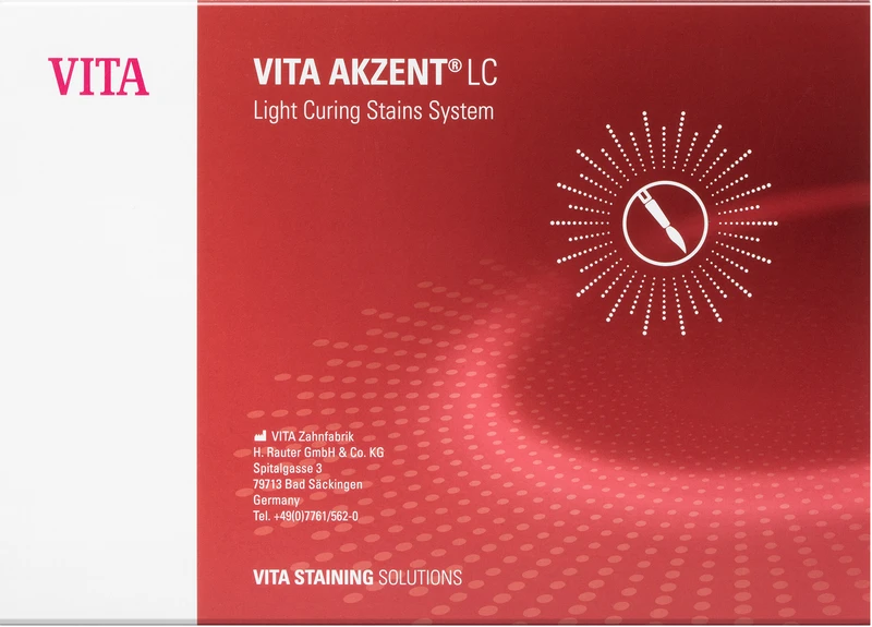 VITA AKZENT® LC ist ein Malfarben-/Glasursystem zur Charakterisierung aller indirekten Versorgungen aus Komposit, Polymer und Hybridkeramik. Die Malfarben ermöglichen eine detailgetreue Effektreproduktion und zuverlässige Farbkorrektur. VITA AKZENT® LC sind lichthärtende Kompositmalfarben zur Reproduktion individueller Farbeffekte, sowie zur Umsetzung von Farbkorrekturen. Das Malfarbensystem überzeugt neben seinem Facettenreichtum durch effizient-präzise Farbapplikation und gute Farb- bzw. Glanzbeständigkeit.