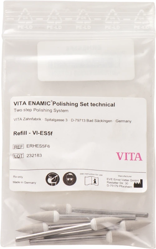 Die VITA ENAMIC® Polierkörpersets wurden für die sichere, wirtschaftliche und materialgerechte Oberflächenbearbeitung von Restaurationen aus Hybridkeramik in Praxis und Labor entwickelt. Die Sets beinhalten diverse Polierkörper zur Vor- und Hochglanzpolitur. Mit diesen Instrumenten können Kauflächen, Höcker, Fissuren und Kontaktpunkte der Restauration materialschonend poliert werden. Im Endergebnis sorgen diese Polierinstrumente für Oberflächen mit einem exzellenten Glanzgrad.