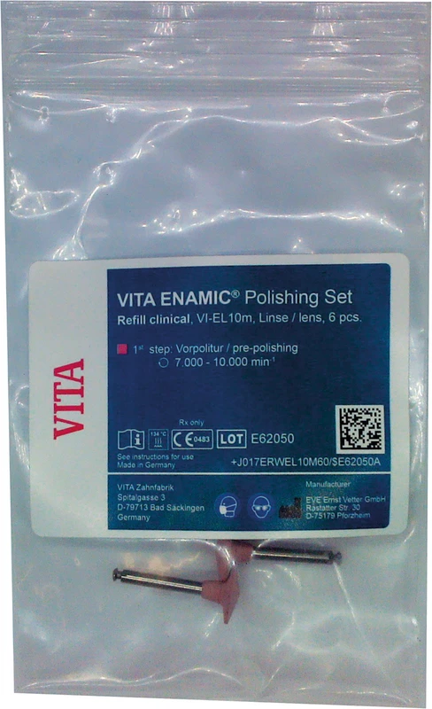 Die VITA ENAMIC® Polierkörpersets wurden für die sichere, wirtschaftliche und materialgerechte Oberflächenbearbeitung von Restaurationen aus Hybridkeramik in Praxis und Labor entwickelt. Die Sets beinhalten diverse Polierkörper zur Vor- und Hochglanzpolitur. Mit diesen Instrumenten können Kauflächen, Höcker, Fissuren und Kontaktpunkte der Restauration materialschonend poliert werden. Im Endergebnis sorgen diese Polierinstrumente für Oberflächen mit einem exzellenten Glanzgrad.