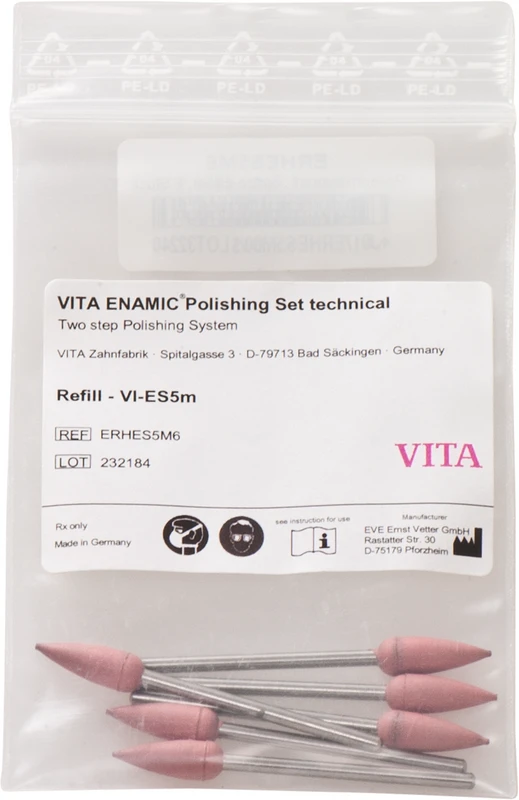 Die VITA ENAMIC® Polierkörpersets wurden für die sichere, wirtschaftliche und materialgerechte Oberflächenbearbeitung von Restaurationen aus Hybridkeramik in Praxis und Labor entwickelt. Die Sets beinhalten diverse Polierkörper zur Vor- und Hochglanzpolitur. Mit diesen Instrumenten können Kauflächen, Höcker, Fissuren und Kontaktpunkte der Restauration materialschonend poliert werden. Im Endergebnis sorgen diese Polierinstrumente für Oberflächen mit einem exzellenten Glanzgrad.