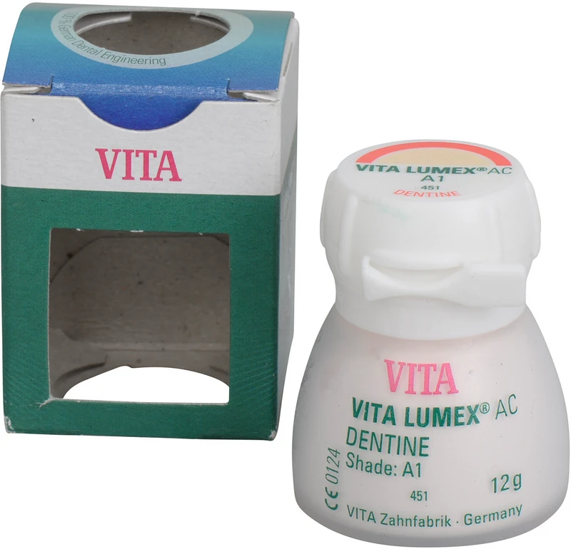 VITA LUMEX® AC ist ein leuzitverstärktes, glaskeramisches Verblendsystem mit innovativer Materialformel für farbtreue, lebendige und verlässliche Ergebnisse. VITA LUMEX AC® umfasst GINGIVA-, OPAQUE-, OPAQUE DENTINE-, DENTINE- und ENAMEL-Massen sowie vielfältige Effektmassen (z. B. OPAL TRANSLUCENT, FLUO INTENSE u.v.m.). Ideal abgestimmte Systemkompnenten wie Pinsel, Brenngutträger, Glasurmasse etc.. Vorteile