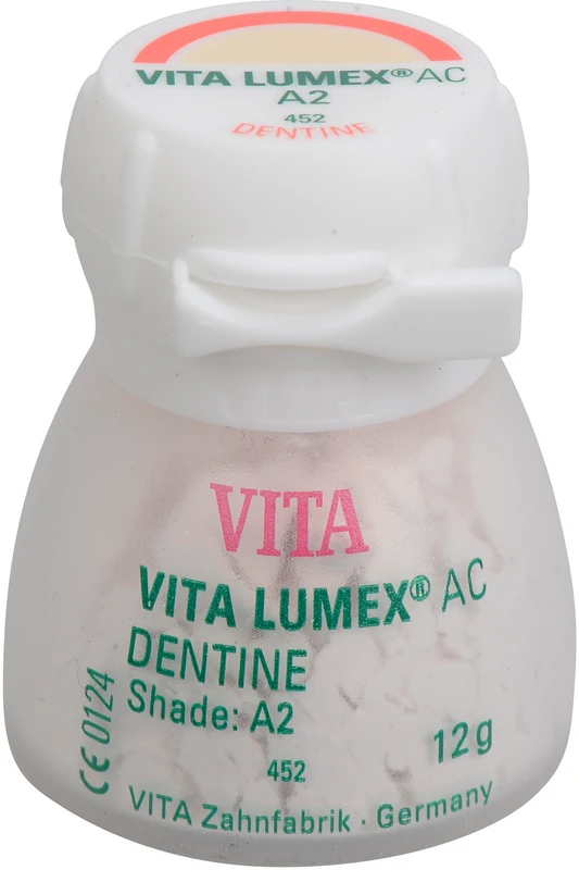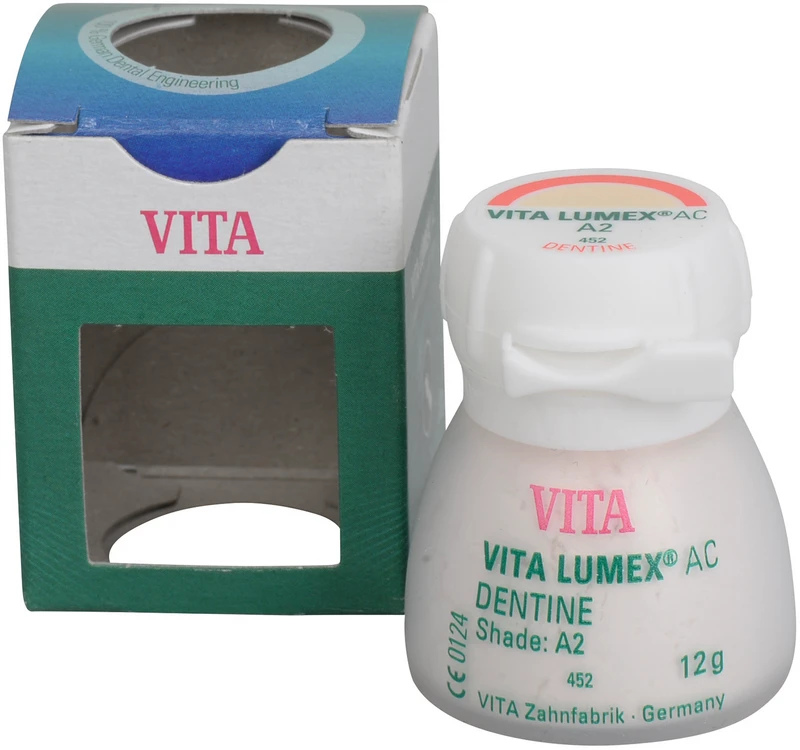 VITA LUMEX® AC ist ein leuzitverstärktes, glaskeramisches Verblendsystem mit innovativer Materialformel für farbtreue, lebendige und verlässliche Ergebnisse. VITA LUMEX AC® umfasst GINGIVA-, OPAQUE-, OPAQUE DENTINE-, DENTINE- und ENAMEL-Massen sowie vielfältige Effektmassen (z. B. OPAL TRANSLUCENT, FLUO INTENSE u.v.m.). Ideal abgestimmte Systemkompnenten wie Pinsel, Brenngutträger, Glasurmasse etc.. Vorteile