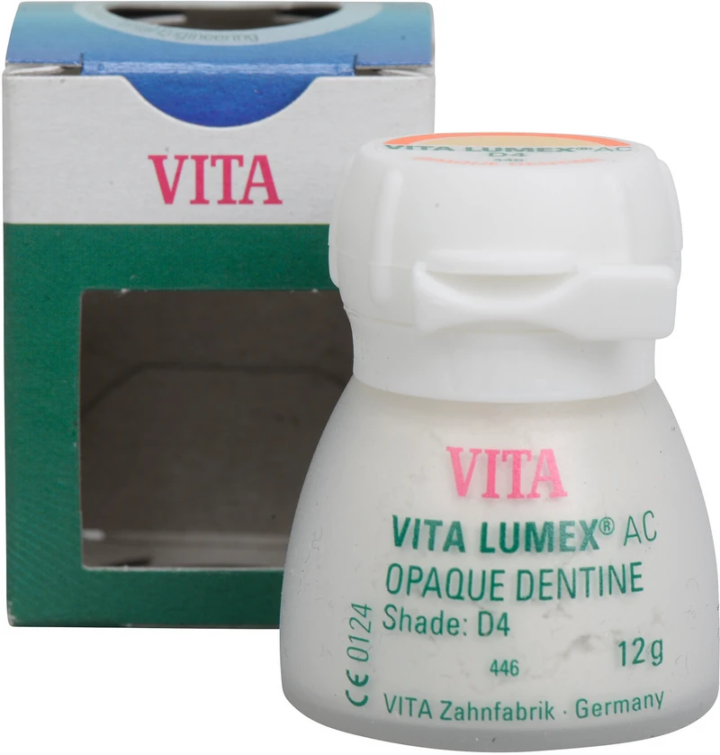 VITA LUMEX® AC ist ein leuzitverstärktes, glaskeramisches Verblendsystem mit innovativer Materialformel für farbtreue, lebendige und verlässliche Ergebnisse. VITA LUMEX AC® umfasst GINGIVA-, OPAQUE-, OPAQUE DENTINE-, DENTINE- und ENAMEL-Massen sowie vielfältige Effektmassen (z. B. OPAL TRANSLUCENT, FLUO INTENSE u.v.m.). Ideal abgestimmte Systemkompnenten wie Pinsel, Brenngutträger, Glasurmasse etc.. Vorteile