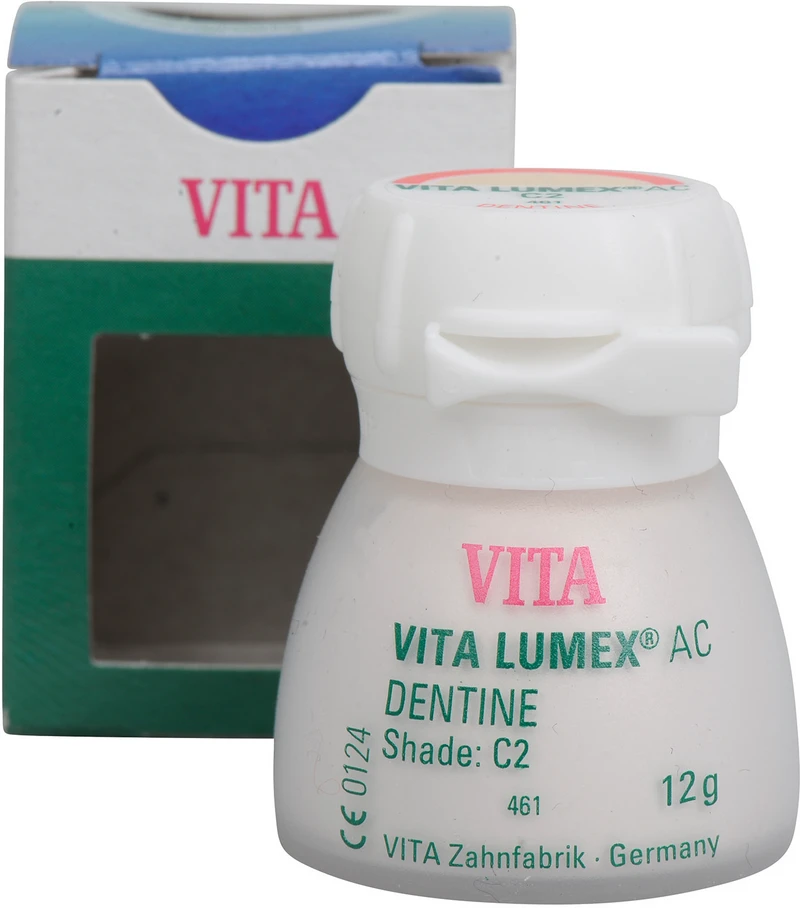 VITA LUMEX® AC ist ein leuzitverstärktes, glaskeramisches Verblendsystem mit innovativer Materialformel für farbtreue, lebendige und verlässliche Ergebnisse. VITA LUMEX AC® umfasst GINGIVA-, OPAQUE-, OPAQUE DENTINE-, DENTINE- und ENAMEL-Massen sowie vielfältige Effektmassen (z. B. OPAL TRANSLUCENT, FLUO INTENSE u.v.m.). Ideal abgestimmte Systemkompnenten wie Pinsel, Brenngutträger, Glasurmasse etc.. Vorteile