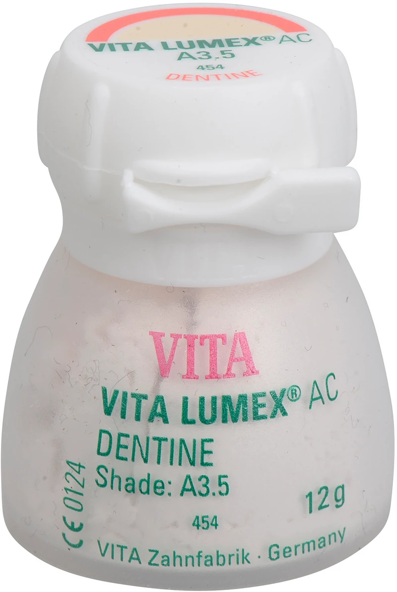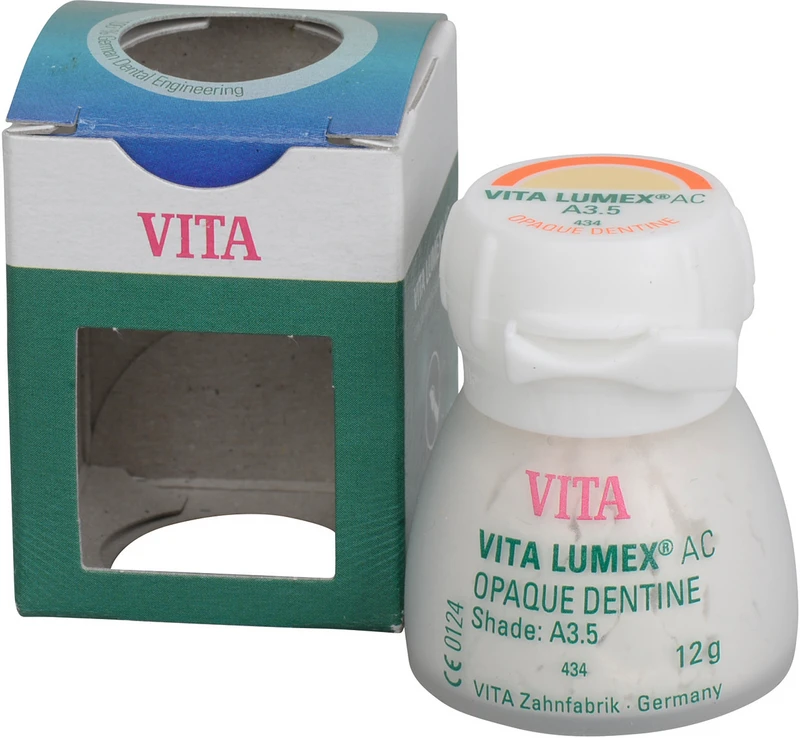 VITA LUMEX® AC ist ein leuzitverstärktes, glaskeramisches Verblendsystem mit innovativer Materialformel für farbtreue, lebendige und verlässliche Ergebnisse. VITA LUMEX AC® umfasst GINGIVA-, OPAQUE-, OPAQUE DENTINE-, DENTINE- und ENAMEL-Massen sowie vielfältige Effektmassen (z. B. OPAL TRANSLUCENT, FLUO INTENSE u.v.m.). Ideal abgestimmte Systemkompnenten wie Pinsel, Brenngutträger, Glasurmasse etc.. Vorteile