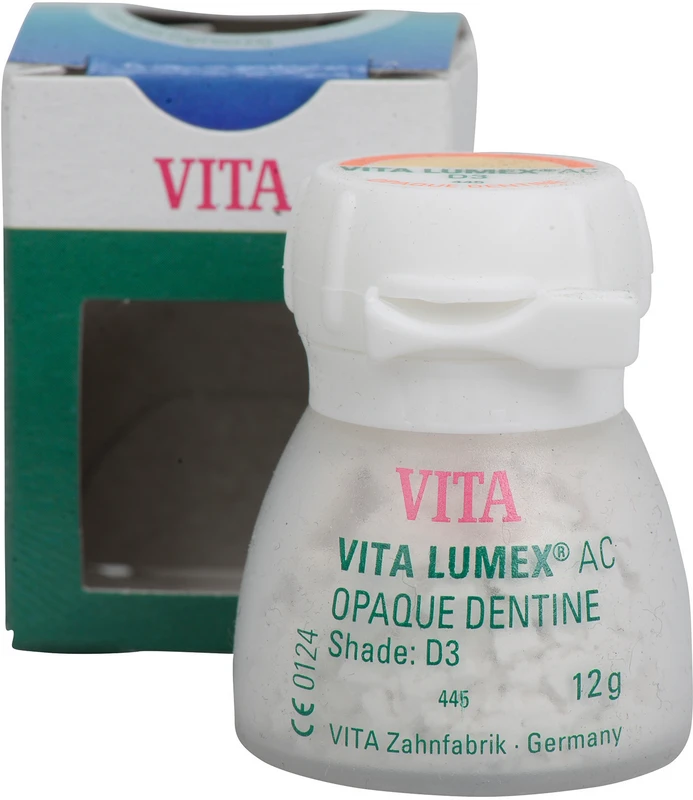 VITA LUMEX® AC ist ein leuzitverstärktes, glaskeramisches Verblendsystem mit innovativer Materialformel für farbtreue, lebendige und verlässliche Ergebnisse. VITA LUMEX AC® umfasst GINGIVA-, OPAQUE-, OPAQUE DENTINE-, DENTINE- und ENAMEL-Massen sowie vielfältige Effektmassen (z. B. OPAL TRANSLUCENT, FLUO INTENSE u.v.m.). Ideal abgestimmte Systemkompnenten wie Pinsel, Brenngutträger, Glasurmasse etc.. Vorteile