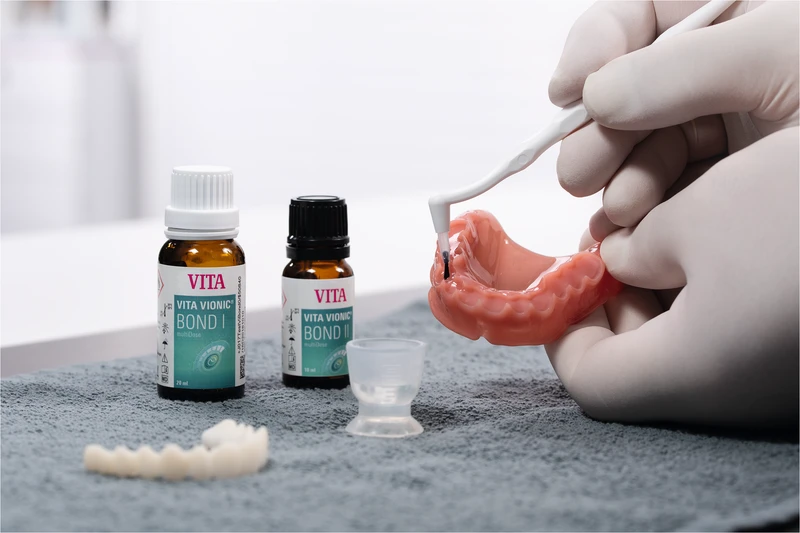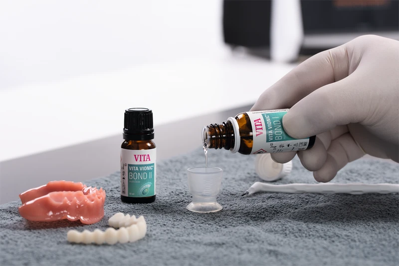 VITA VIONIC® BOND dient zur definitiven Verklebung von Prothesenzähnen mit Prothesenbasen im digital gestützten Herstellprozess von herausnehmbaren Prothesen. Die VITA VIONIC BOND Flüssigkeiten müssen gekühlt, zwischen 5°C (41°F) und 10°C (50°F), gelagert werden. Die Haltbarkeit ab Herstelldatum beträgt 18 Monate.