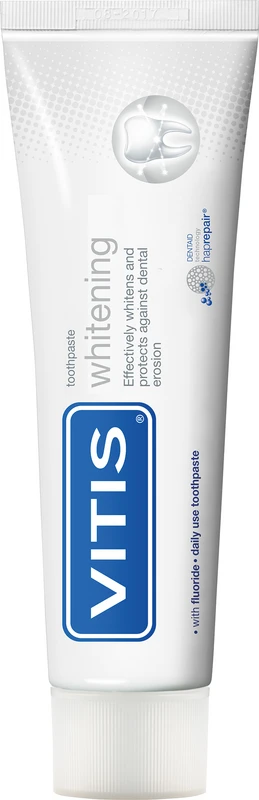 Die Rezeptur von VITIS® whitening enthält die innovative Haprepair-Technologie von DENTAID. Das aktive Hydroxylapatit kann unregelmäßige Flächen im Zahnschmelz auffüllen und reparieren, wodurch die Zähne glatt und hell werden. Gleichzeitig bildet es eine Schutzschicht.