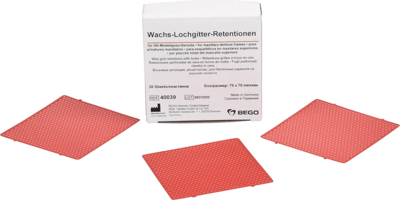 Retentionen für partielle OK-Modellguss-Prothesen und als Verstärkung bei totalen OK-Kunststoff-Prothesen. Mit ihnen können die Retentionen an totalen oder partiellen Prothesen einfach und effektiv gestaltet werden. Sie gewährleisten eine große Sicherheit bei der Verbindung des Kunststoffes mit der Modellgussplatte. Die großdimensionierten Gitterretentionen ermöglichen ein sehr materialsparendes Arbeiten.
