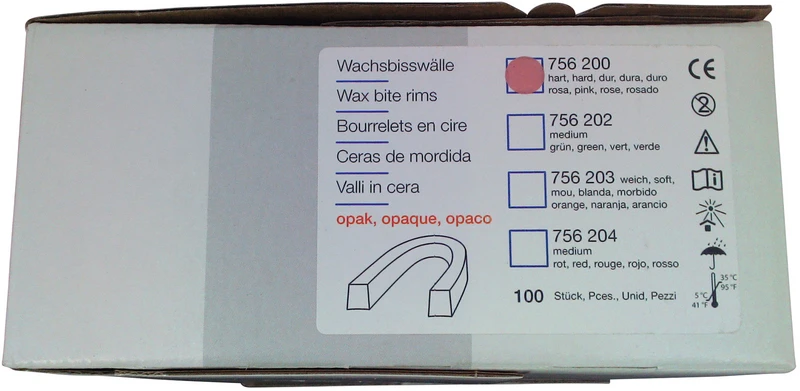 Gebogen für die Vollprothetik. Mit Einziehung auf der Unterseite zur besseren Fixierung auf dem Kieferkamm. Die Wachsbisswälle sind oxydfrei oder oxydhaltig lieferbar. Letztere zeichnen sich durch sehr opake Farben aus, wodurch die optische Beurteilung wesentlich vereinfacht wird.