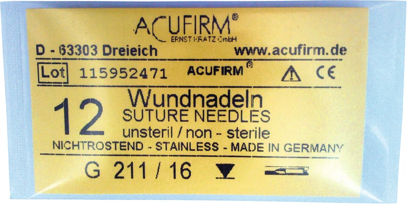 Produktinformationen "Wundnadeln Packung 12 Stück Edelstahl, 211G, 1\2 Kreis, außenschneidend, Größe 16"